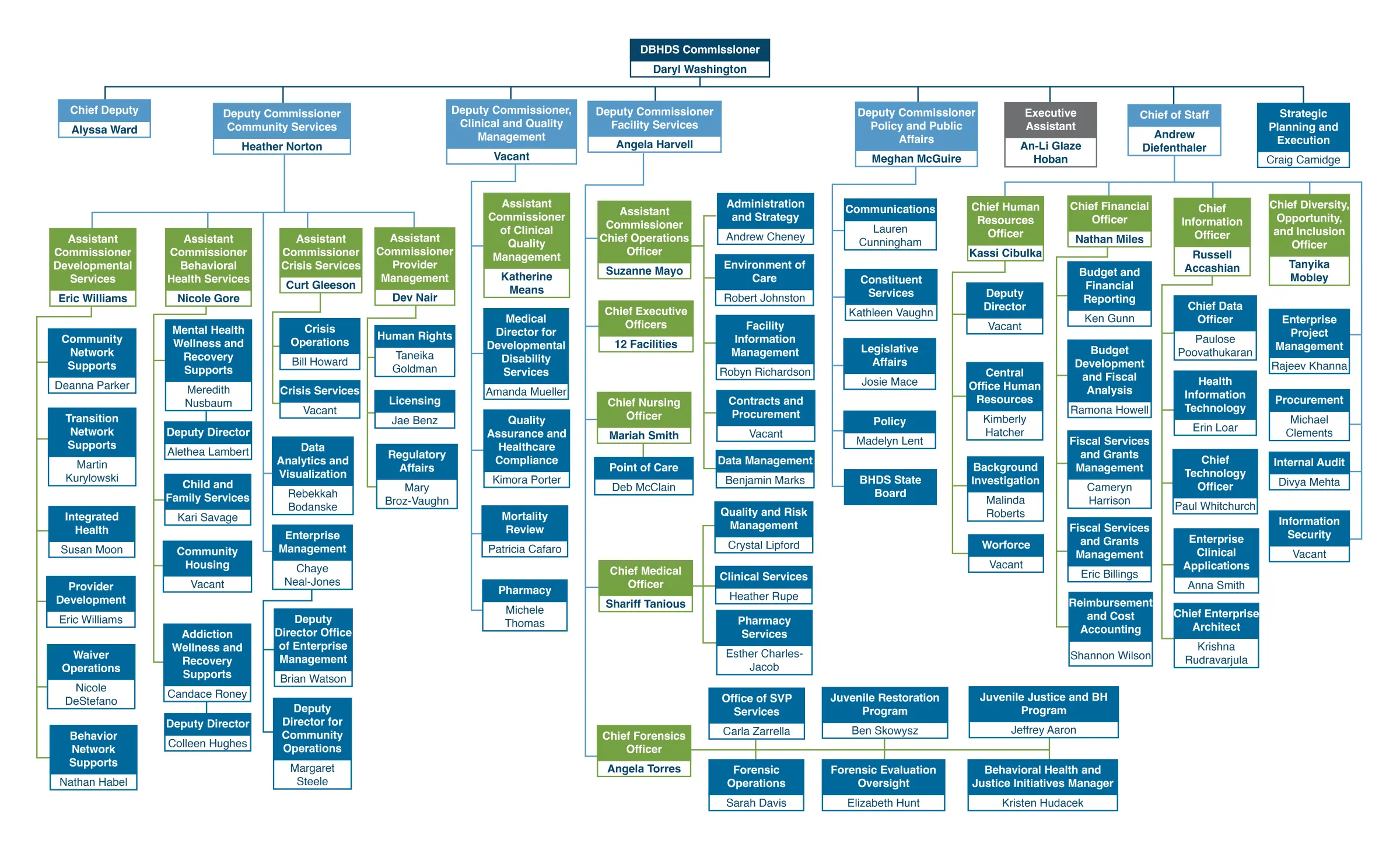Esta sección enumera a los líderes de DBHDS que apoyan las operaciones, la estrategia, la supervisión y las funciones especializadas a nivel departamental.