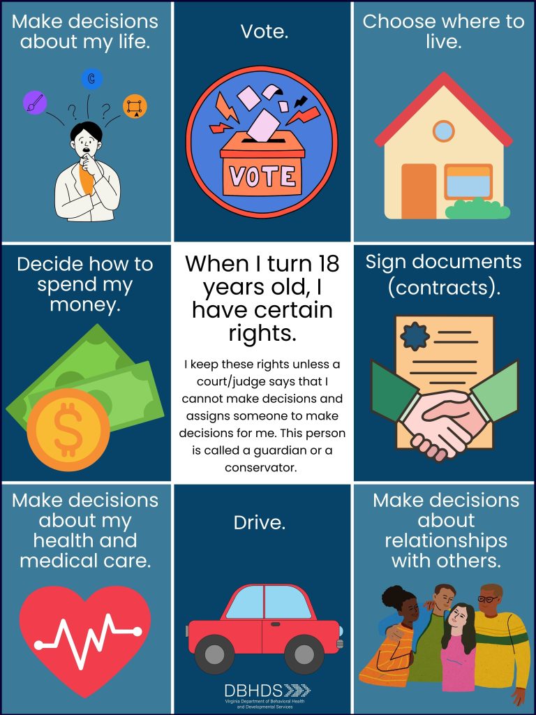 Virginia ahora reconoce formalmente los Acuerdos de Toma de Decisiones Apoyados como una alternativa a las opciones de toma de decisiones más restrictivas y sustitutivas, como las tutelas legales (Código de Virginia 37.2-314.3.). Los Acuerdos de Toma de Decisiones con Apoyo son una forma para que los adultos con discapacidades del desarrollo que viven en Virginia documenten cuándo quieren recibir apoyo para tomar decisiones, cómo quieren recibir apoyo y a quién quieren que les ayude. Los Acuerdos de Toma de Decisiones con Apoyo brindan a las personas con discapacidades del desarrollo la capacidad de recibir apoyo para tomar varias decisiones en sus vidas, al mismo tiempo que conservan todos sus derechos, incluido el derecho a tomar sus propias decisiones.