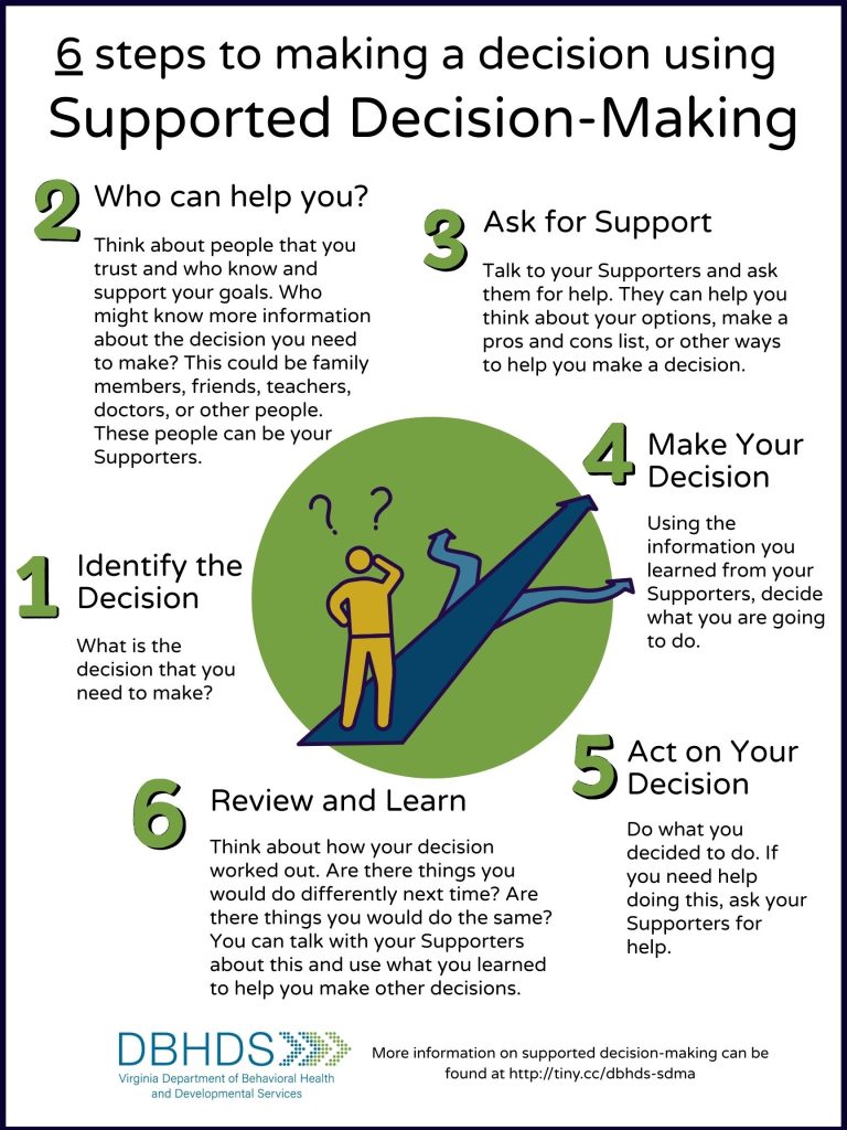 Toma de decisiones apoyada- Tomar una decisión con la ayuda de personas en las que confías. Te ayudan a pensar en tus diferentes opciones, pero tú tomas la decisión final.